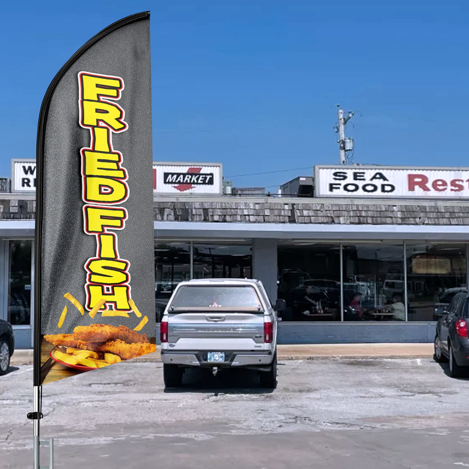 🏠 【Excellent Advertisement Tool】** The size of our Fried Fish feather flags is impressive, standing at 11ft tall and 2.4ft wide, making them visible from far away. Placing these feather banners in front of your business, at the entrance, or on the sidewalk will bring in new customers, ensuring the continued prosperity of your business.