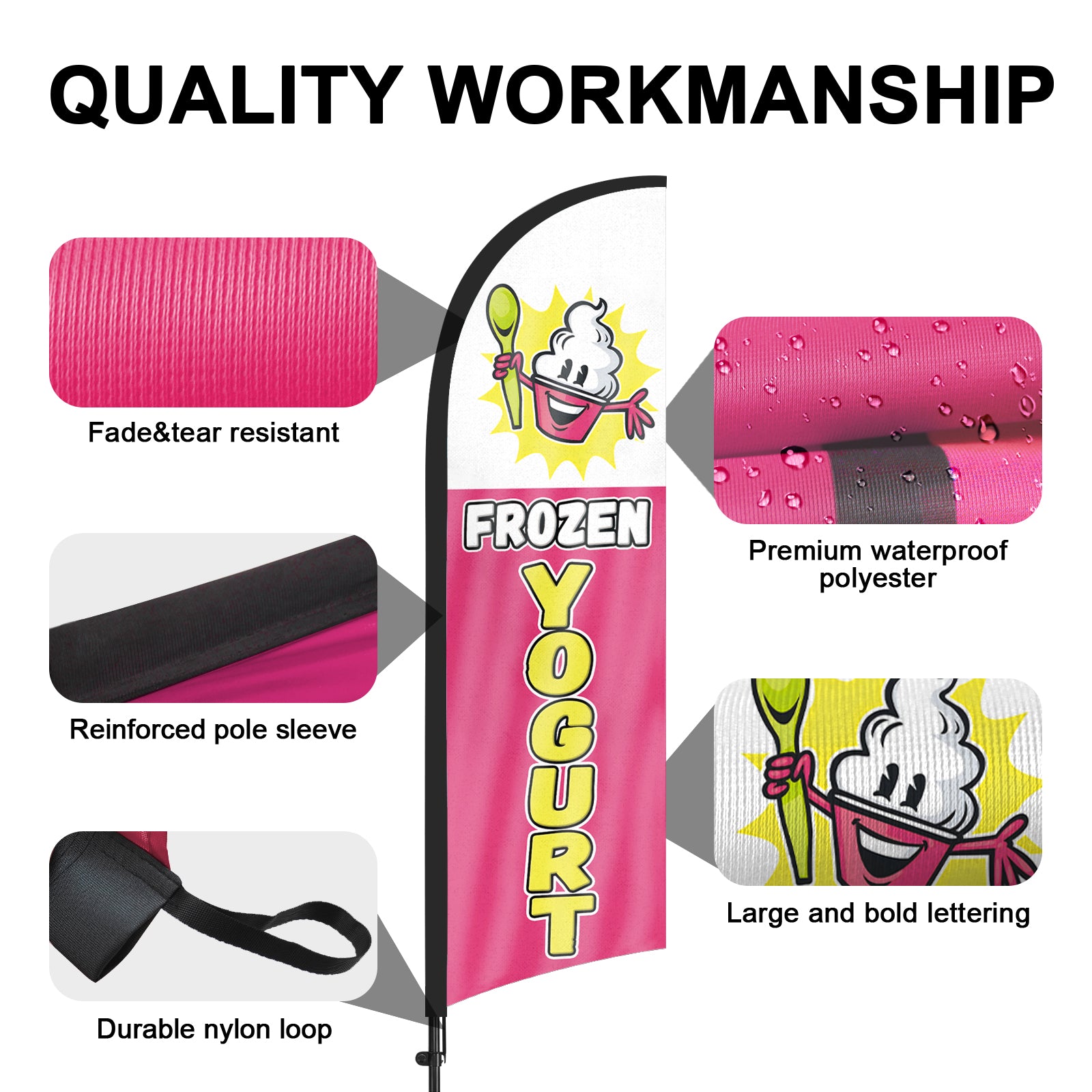 - 【Attention-Grabbing】Frozen yogurt sign stand tall and sway with the wind, making them highly visible and attention-grabbing. The Frozen Yogurt flags’ unique shape and vibrant colors make them stand out in crowded environments, attracting many potential customers from a distance.