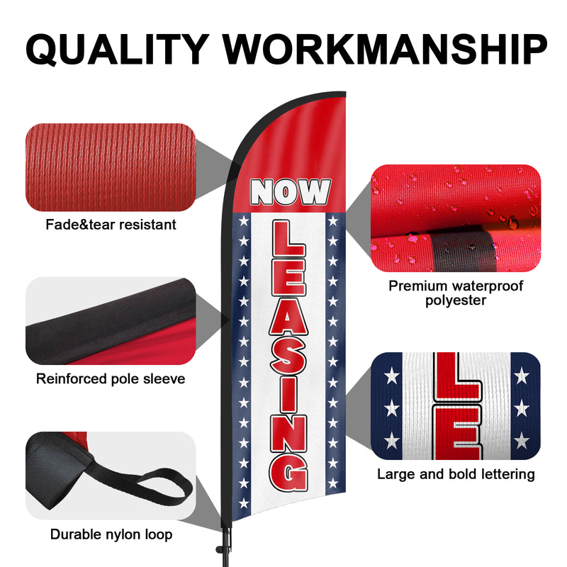 - 【Weather Resistance】These Now Leasing feather flags are designed to withstand various weather conditions, high-quality aluminum and fiberglass pole, tear resistant polyester fabric making it sturdy and heavy-duty to be held up well even in rain, snow, sleet and strong winds.