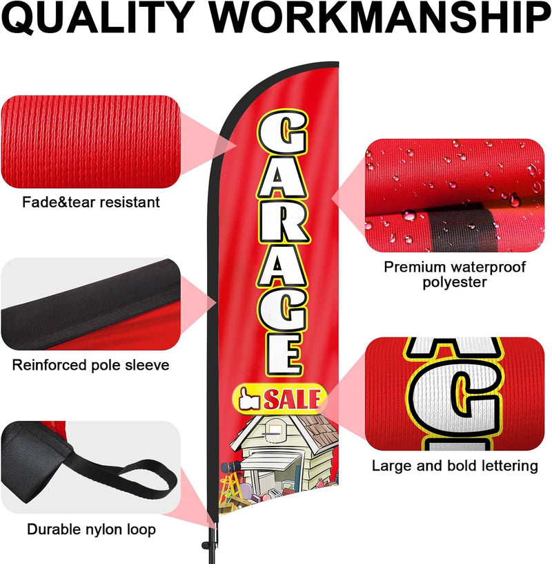 - 【Weather Resistance】These Yard Sale feather flags are designed to withstand various weather conditions, high-quality aluminum and fiberglass pole, tear resistant polyester fabric making it sturdy and heavy-duty to be held up well even in rain, snow, sleet and strong winds.