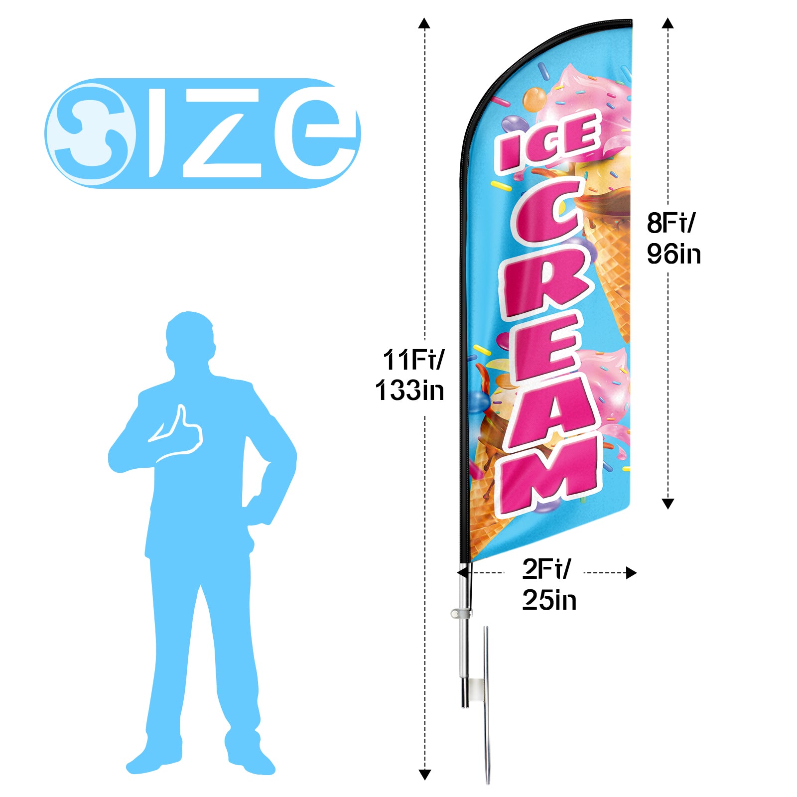 - 🏠【Excellent Advertisement Tool】The Ice Cream feather flag size is very large (11ft/ 330cm) tall and (2.1 ft/ 65cm) wide, visible enough from far away, you may put the feather banner up in front of your business, at the entry or on the sidewalk, really a must-have and cost-effective way to increase traffic to business.