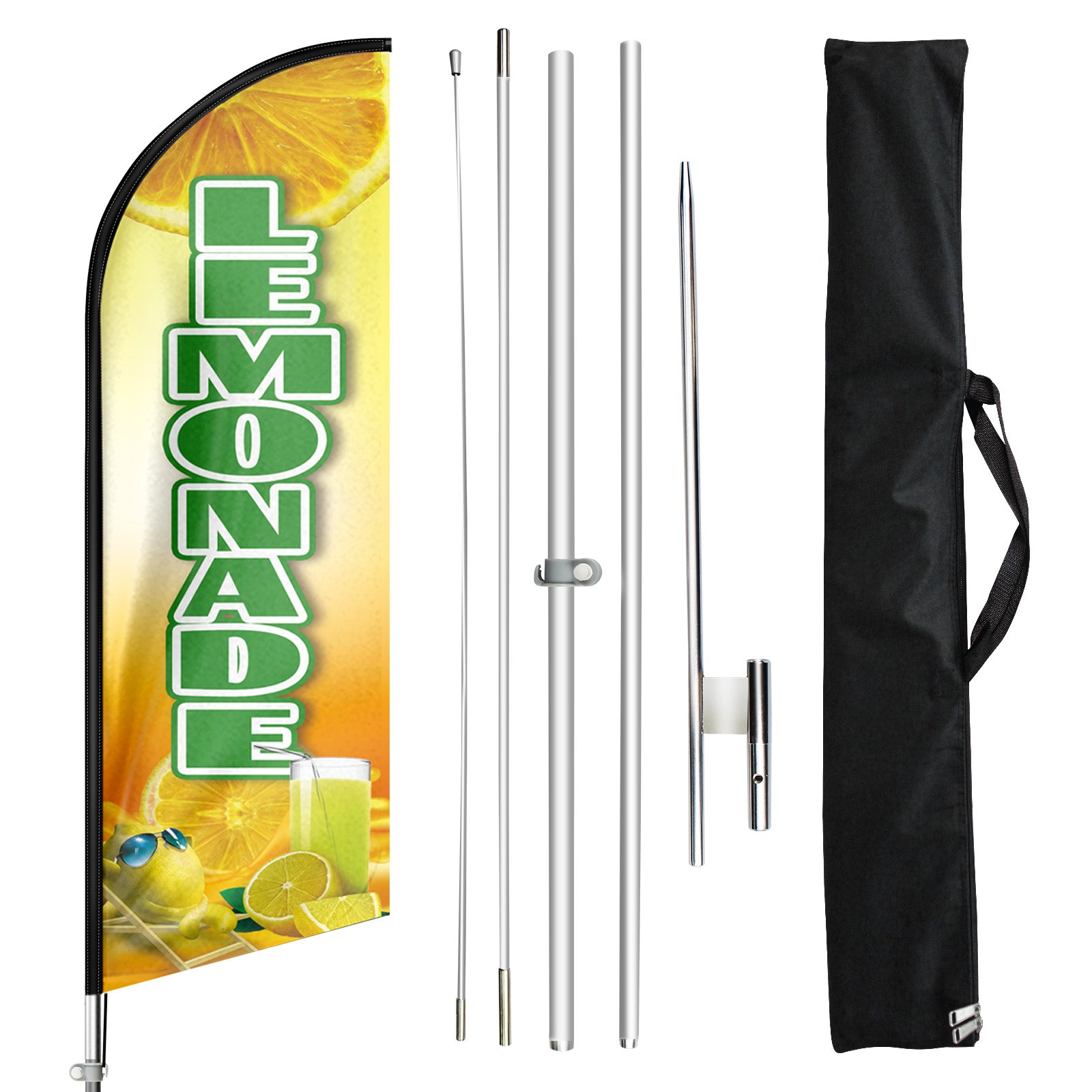 - 🏠【Easy To Assemble and Disassemble】This Lemonade feather flag pole kit includes 1 swooper flag+4 flagpoles+1 ground stake and comes with 1 carry bag. Just snap the pieces together and put the stake in the ground or other stand bases to display the business sign daily and it is portable and easy to pack with the carrying bag when the feather flag pole kit disassembled.