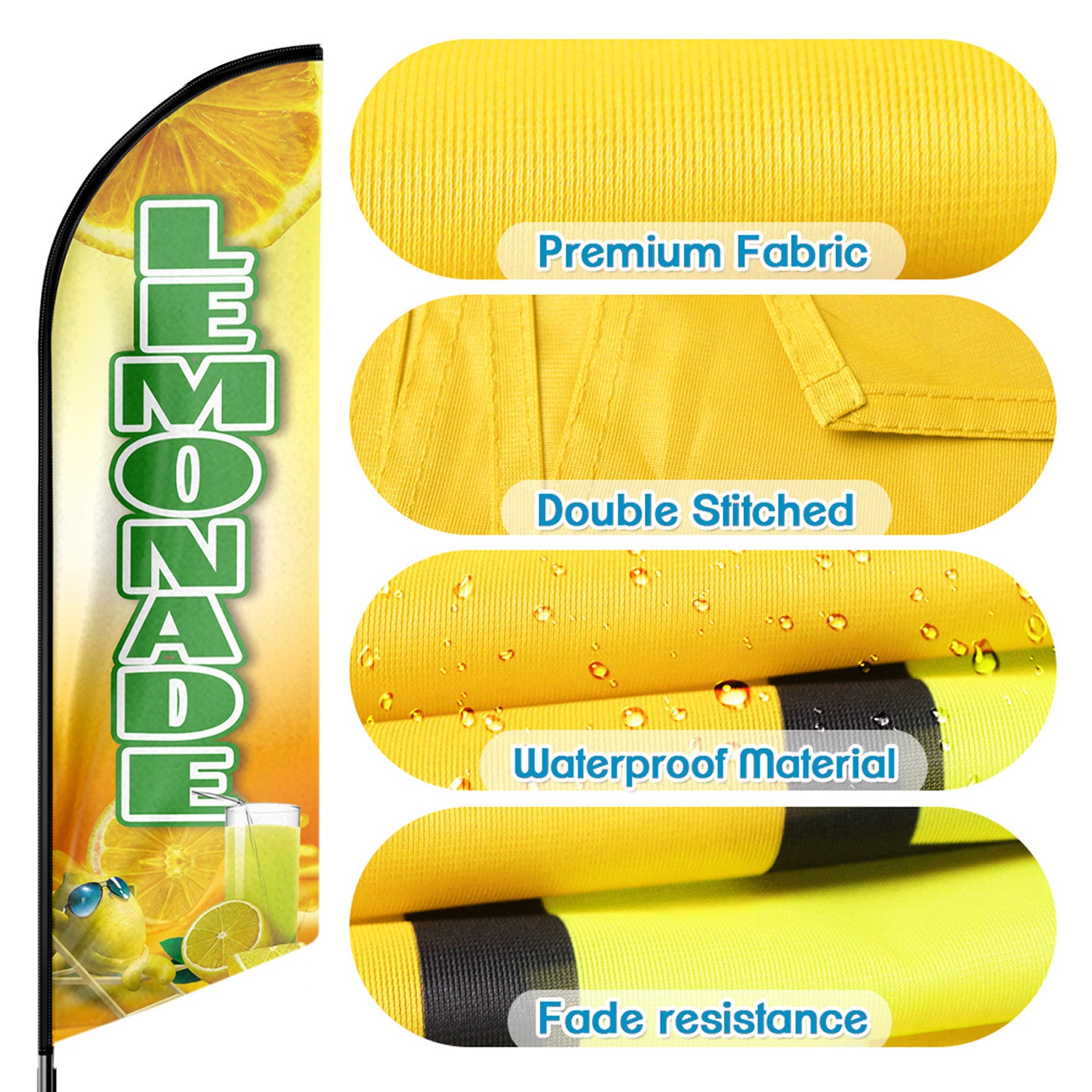 - 🏠【Excellent Advertisement Tool】The Lemonade feather banner size is very large (11ft/ 340cm) tall and (2.1 ft/ 64cm) wide, visible enough from far away, you may put the feather banner up in front of your business, at the entry or on the sidewalk, really a must-have and cost-effective way to increase traffic to business.