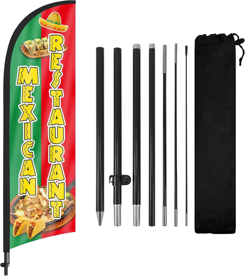 - 【Portable and Easy Setup】This Mexican Restaurant feather flag pole kit includes 1 swooper flag+6 rods+1 ground stake and comes with 1 storage bag. They can be quickly set up and taken down, requiring minimal effort.