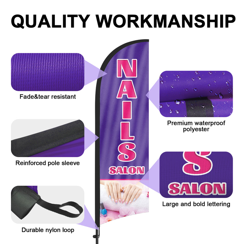 - 【Portable and Easy Setup】This Nails Salon feather flag pole kit includes 1 swooper flag+6 rods+1 ground stake and comes with 1 storage bag. They can be quickly set up and taken down, requiring minimal effort.