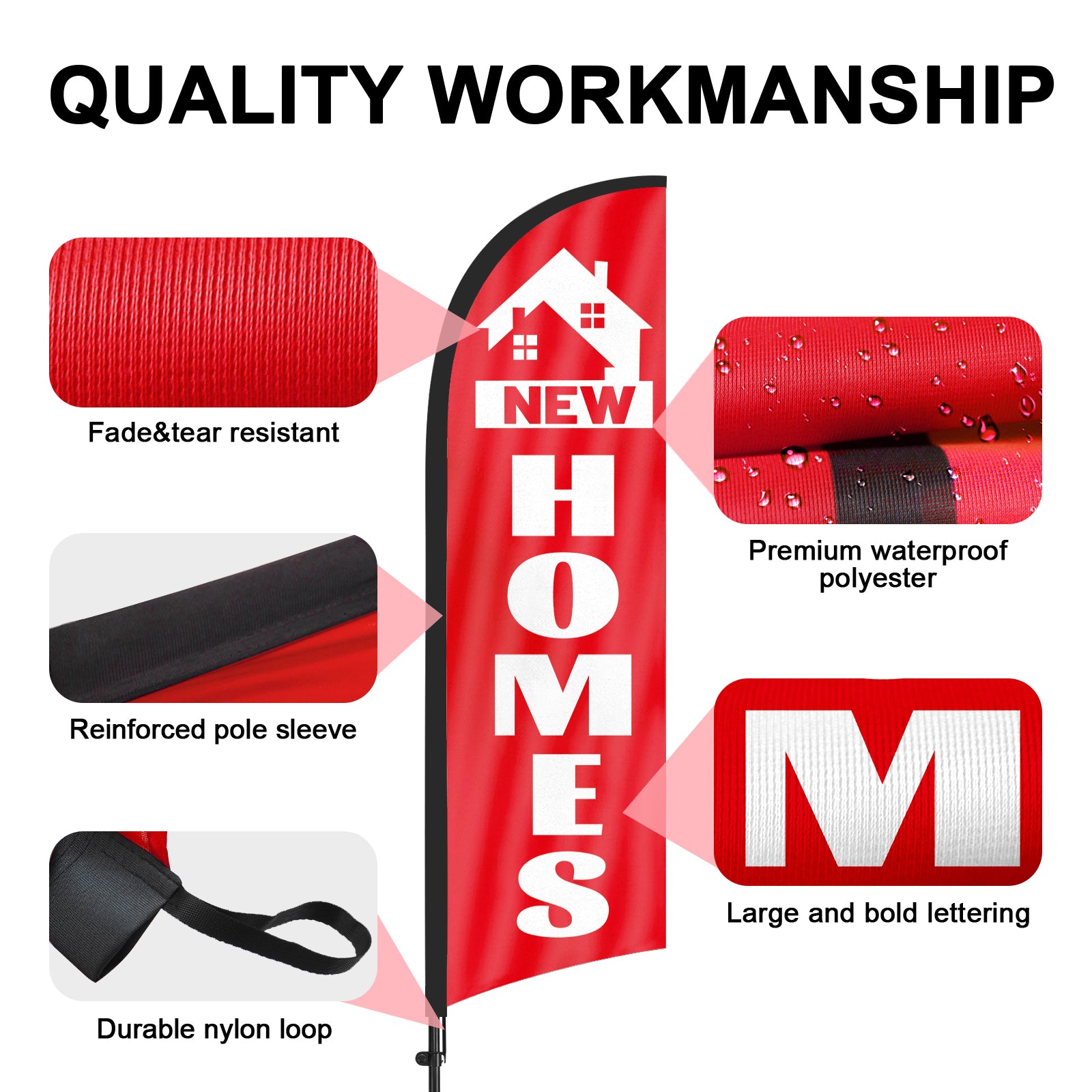 - 【Weather Resistance】These New Homes feather flags are designed to withstand various weather conditions, high-quality aluminum and fiberglass pole, tear resistant polyester fabric making it sturdy and heavy-duty to be held up well even in rain, snow, sleet and strong winds.