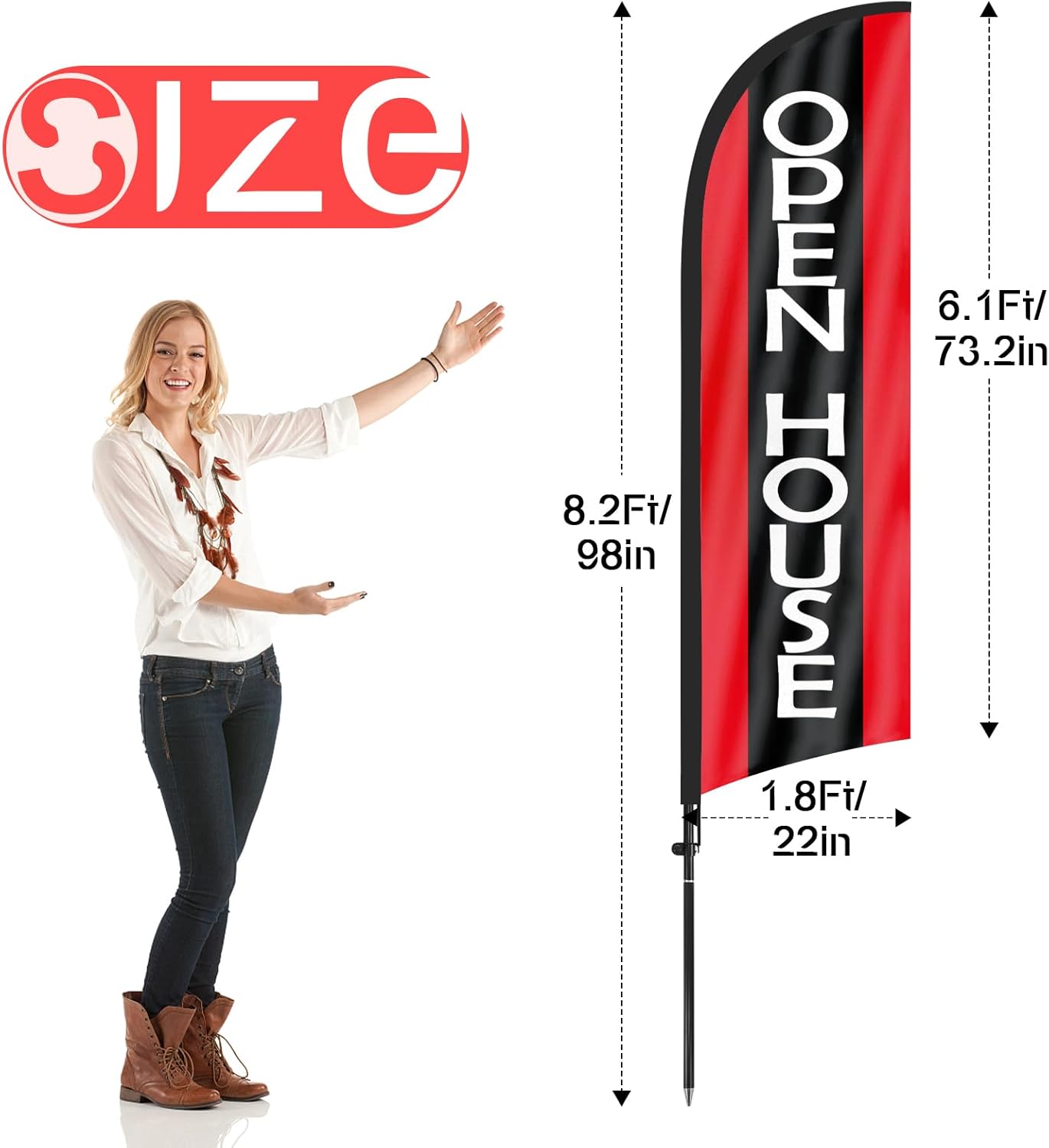 - 【Cost-Effective Advertising】The open house banner offer a cost-effective advertising solution compared to other traditional forms of outdoor advertising. This open house flag size is (8.2ft/98in) tall and (1.8ft/22in) wide, visible enough from far away, ensures your business stands out from the crowd, grabbing attention and increasing foot traffic.