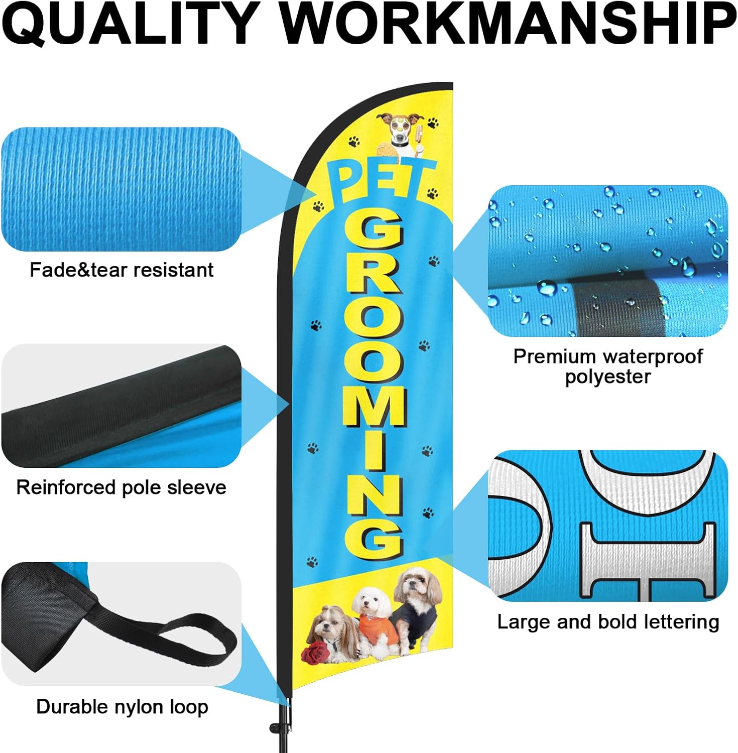 - 【Weather Resistance】These Pet Grooming feather flags are designed to withstand various weather conditions, high-quality aluminum and fiberglass pole, tear resistant polyester fabric making it sturdy and heavy-duty to be held up well even in rain, snow, sleet and strong winds.