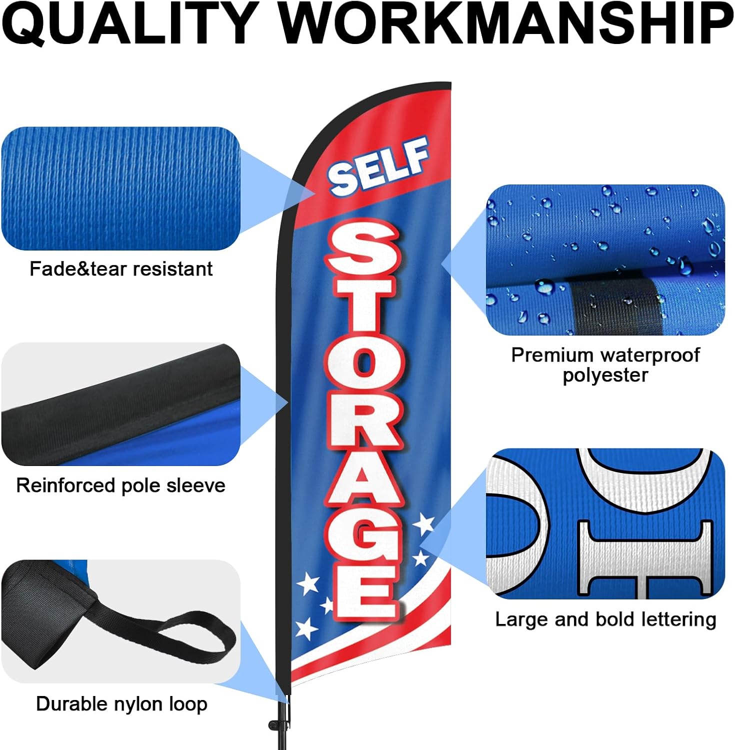 - 【Weather Resistance】These Self Storage feather flags are designed to withstand various weather conditions, high-quality aluminum and fiberglass pole, tear resistant polyester fabric making it sturdy and heavy-duty to be held up well even in rain, snow, sleet and strong winds.