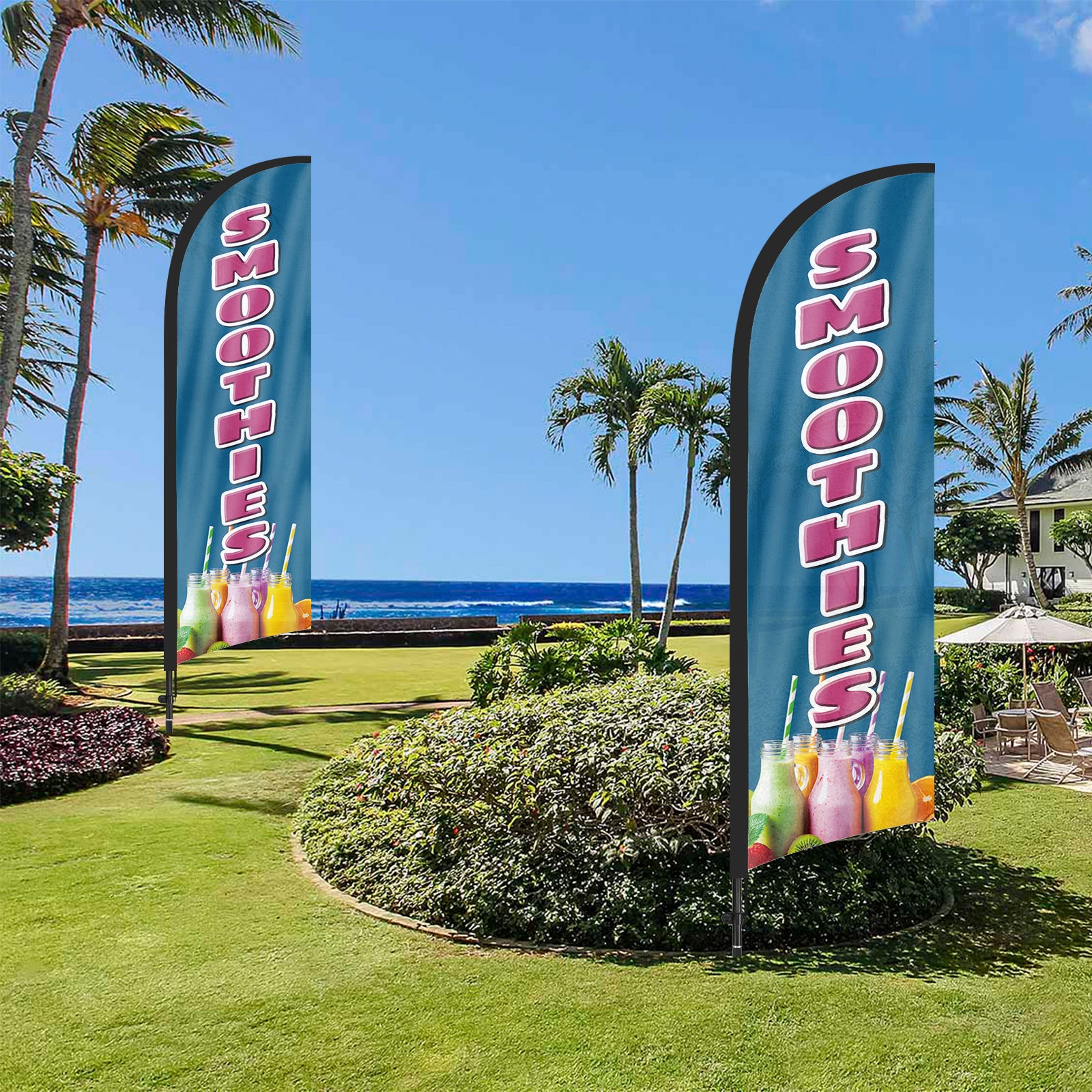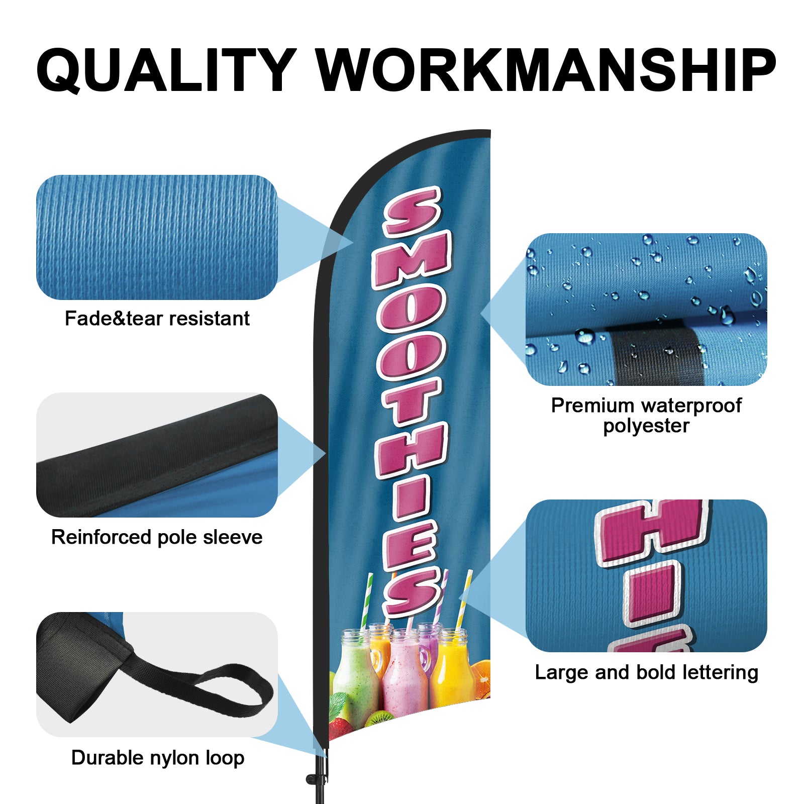 - 【Weather Resistance】These Smoothies feather flags are designed to withstand various weather conditions, high-quality aluminum and fiberglass pole, tear resistant polyester fabric making it sturdy and heavy-duty to be held up well even in rain, snow, sleet and strong winds.
