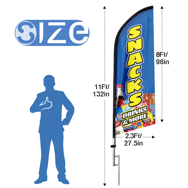 🏠【Excellent Advertisement Tool】The Snacks feather flag size is very large (11ft/ 330cm) tall and (2.4 ft/ 75cm) wide, visible enough from far away, you may put the feather banner up in front of your business, at the entry or on the sidewalk, really a must-have and cost-effective way to increase traffic to business.
