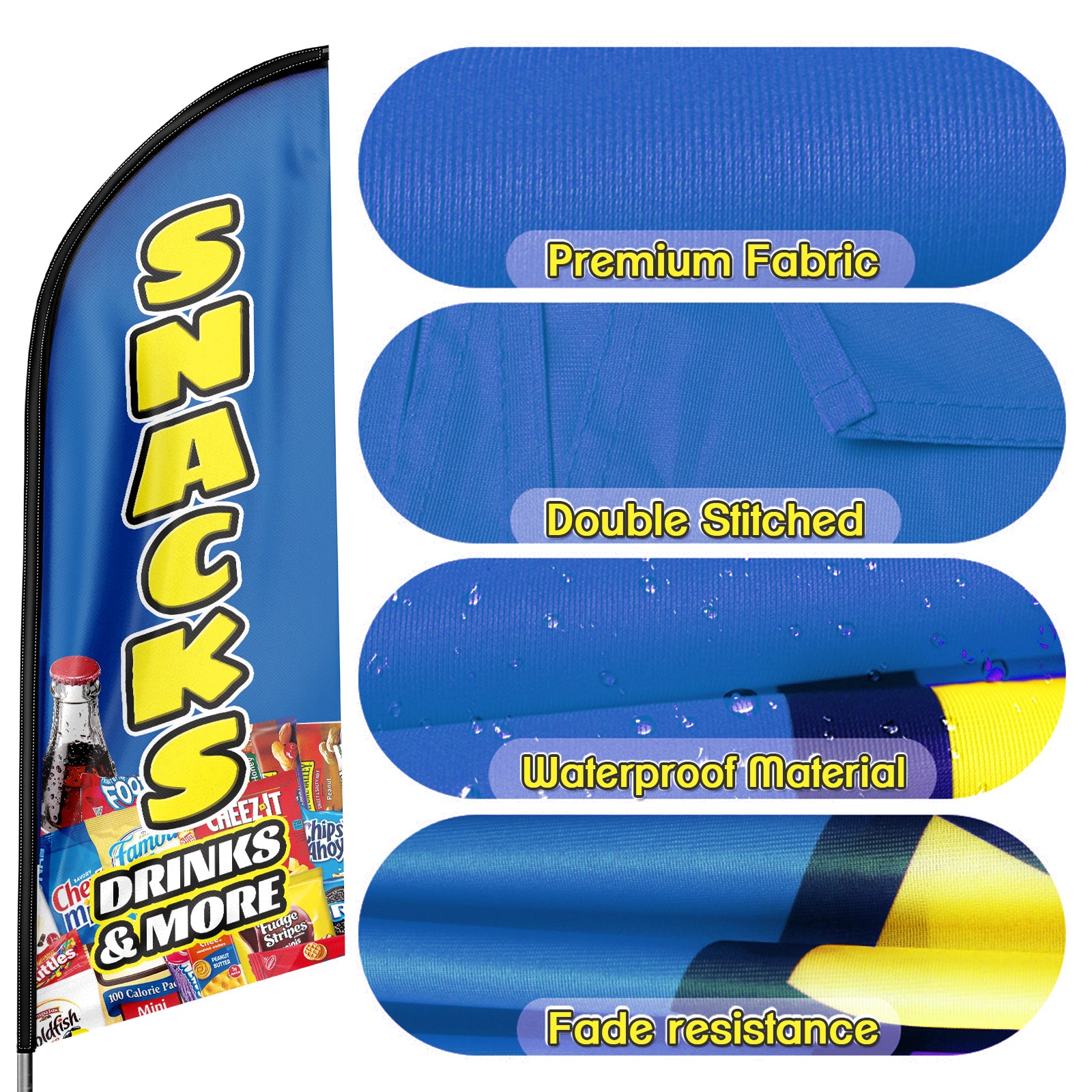 🏠【Great Eye Catcher】Our Snacks swooper flags will be very eye-catching for indoor and outdoor use and make your location or events stand out, the flying feather banner with vibrant colors will grab attention at a distance to attract many new customers to your store.