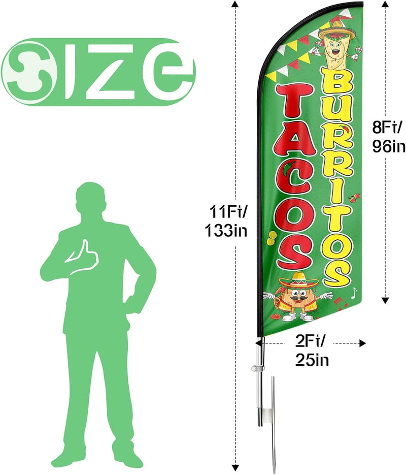 - 🏠【Excellent Advertisement Tool】The Tacos Burritos feather flag size is very large (11ft/ 330cm) tall and (2.1 ft/ 65cm) wide, visible enough from far away, you may put the feather banner up in front of your business, at the entry or on the sidewalk, really a must-have and cost-effective way to increase traffic to business.