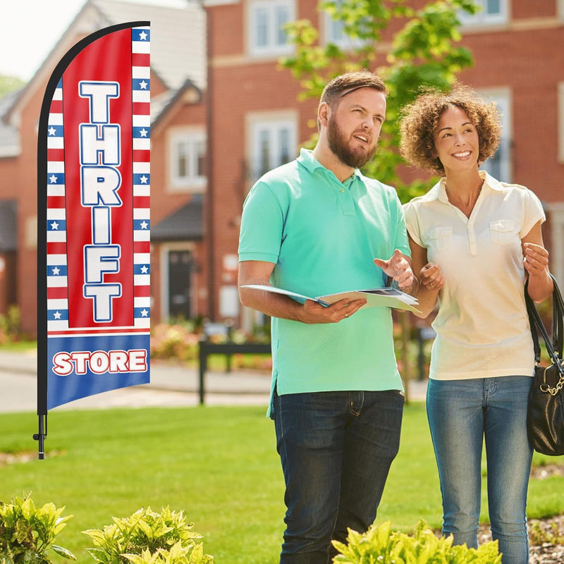 - 【Attention-Grabbing】Thrift Store feather flags stand tall and sway with the wind, making them highly visible and attention-grabbing. The Thrift Store flags’ unique shape and vibrant colors make them stand out in crowded environments, attracting many potential customers from a distance.