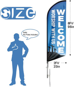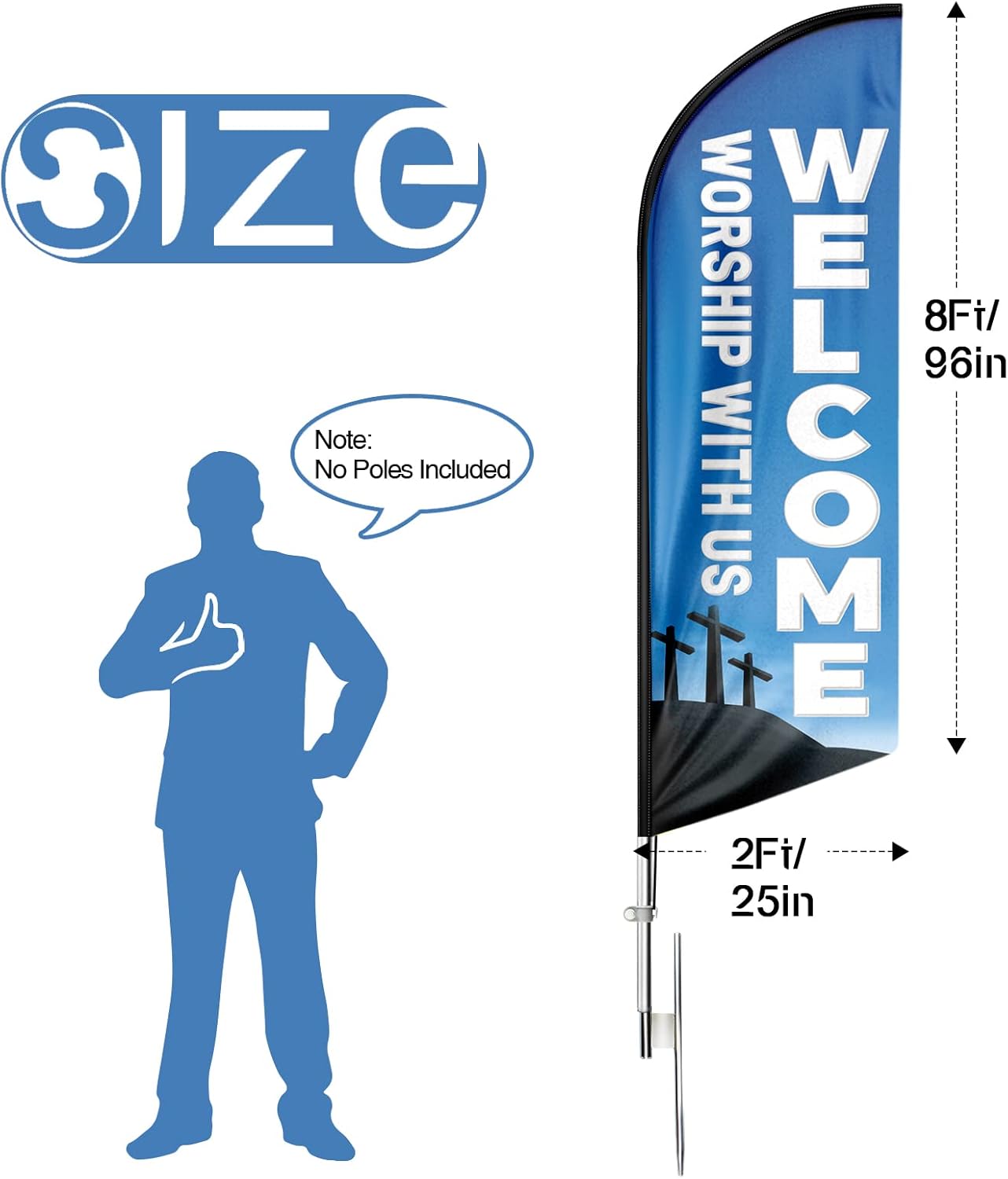 - 【Excellent Advertisement Tool】The Welcome Worship With Us feather flag size is very large (8Ft/96in x 2 Ft/25in) visible enough from far away, you may put the feather banner up in front of your business, at the entry or on the sidewalk.