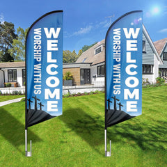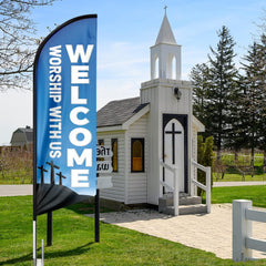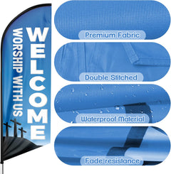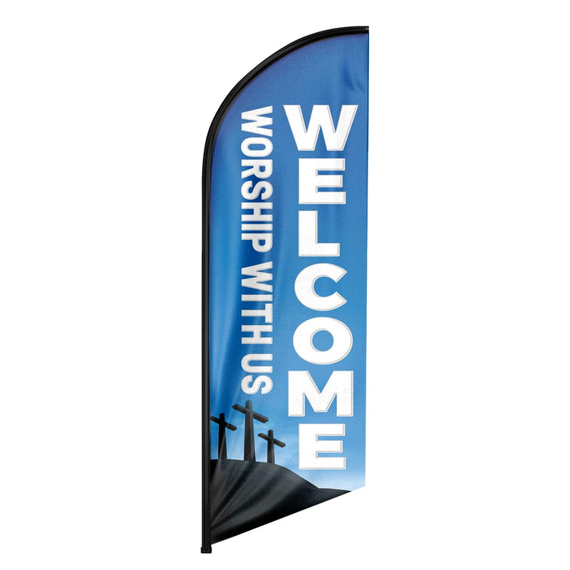 Welcome Worship With Us Feather Flag: Advertising Banner for Welcome Worship With Us Business (8ft, Blue Flagpole Not Included)