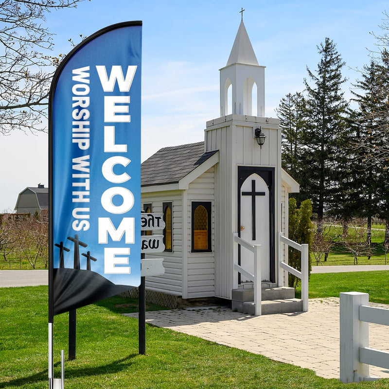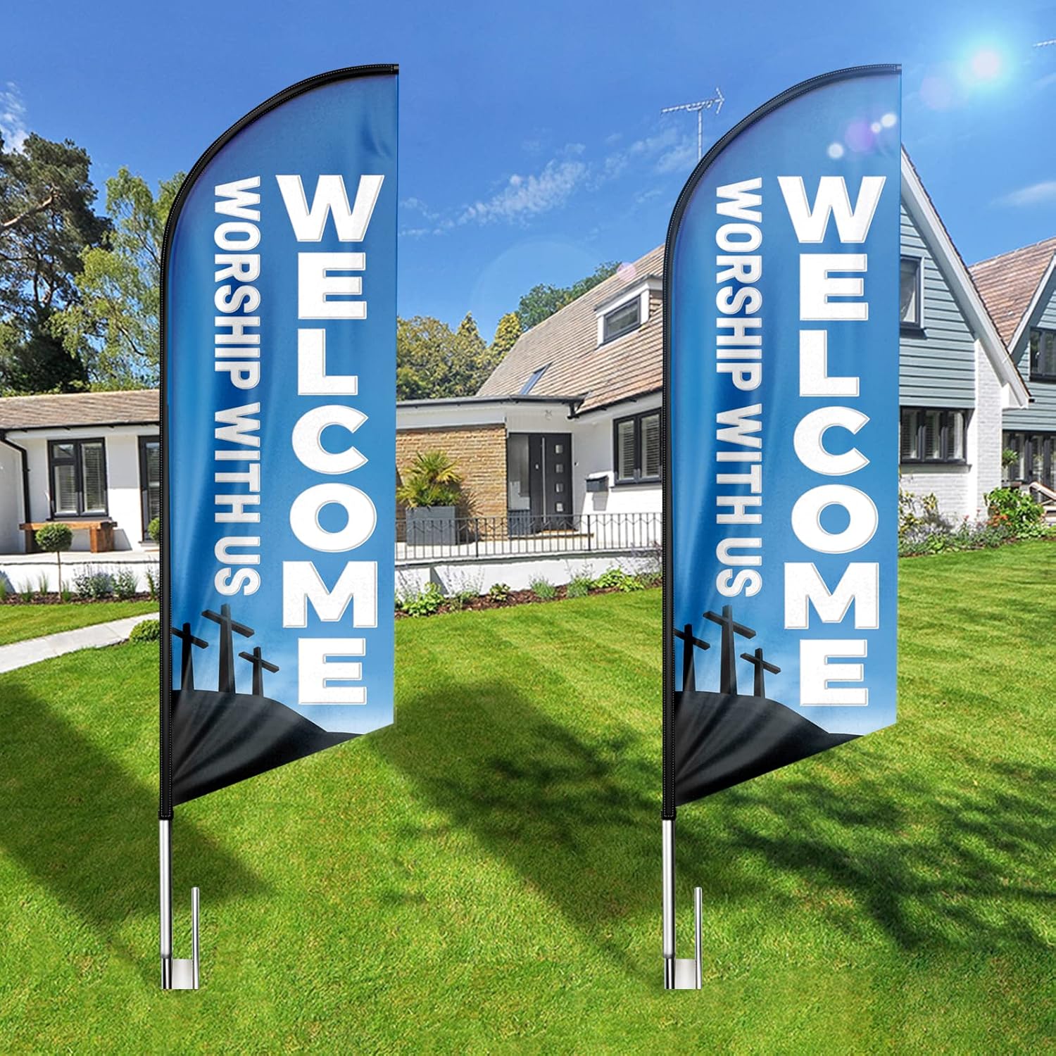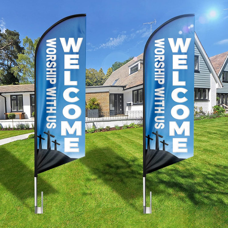 - 【Great Eye Catcher】Our Welcome Worship With Us Feather Flags will be very eye catching for indoor and outdoor use and make your location or events stand out, the flying feather banner with vibrant colors will grab attention at a distance to attract many new customers to your store.