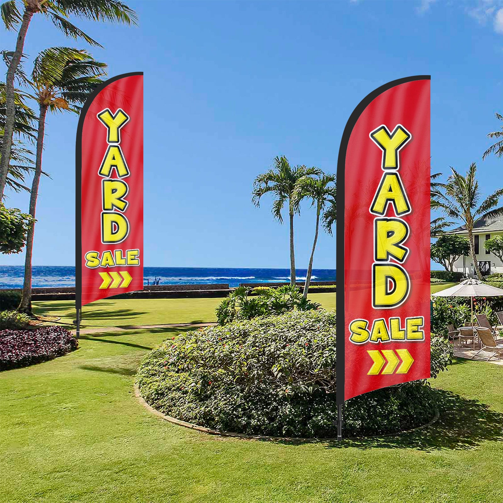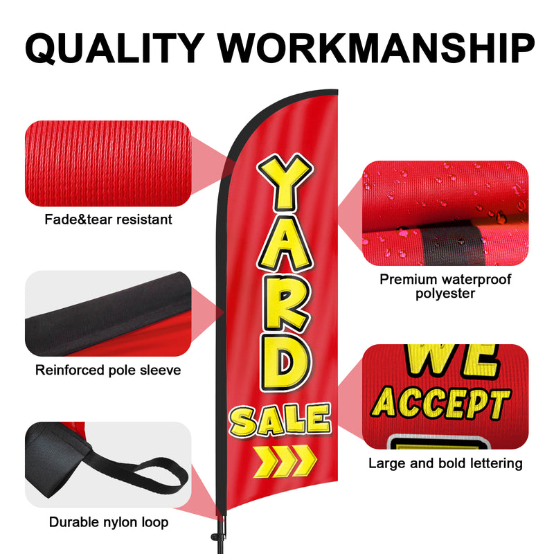- 【Weather Resistance】These Yard Sale feather flags are designed to withstand various weather conditions, high-quality aluminum and fiberglass pole, tear resistant polyester fabric making it sturdy and heavy-duty to be held up well even in rain, snow, sleet and strong winds.